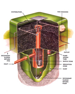 As waste water flows into your sewage treatment plant they enter a primary tank, within this tank the solids and liquids are separated. Following this the liquid flows into a biozone chamber. Within this chamber the fluid is aerated by a pump. this encourages good bacteria to digest organic matter within the waste and break it down as to purify it. A well maintained and efficient sewage treatment plant, will usually produce effluent which is 95% purified.